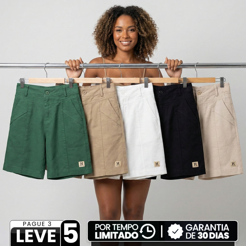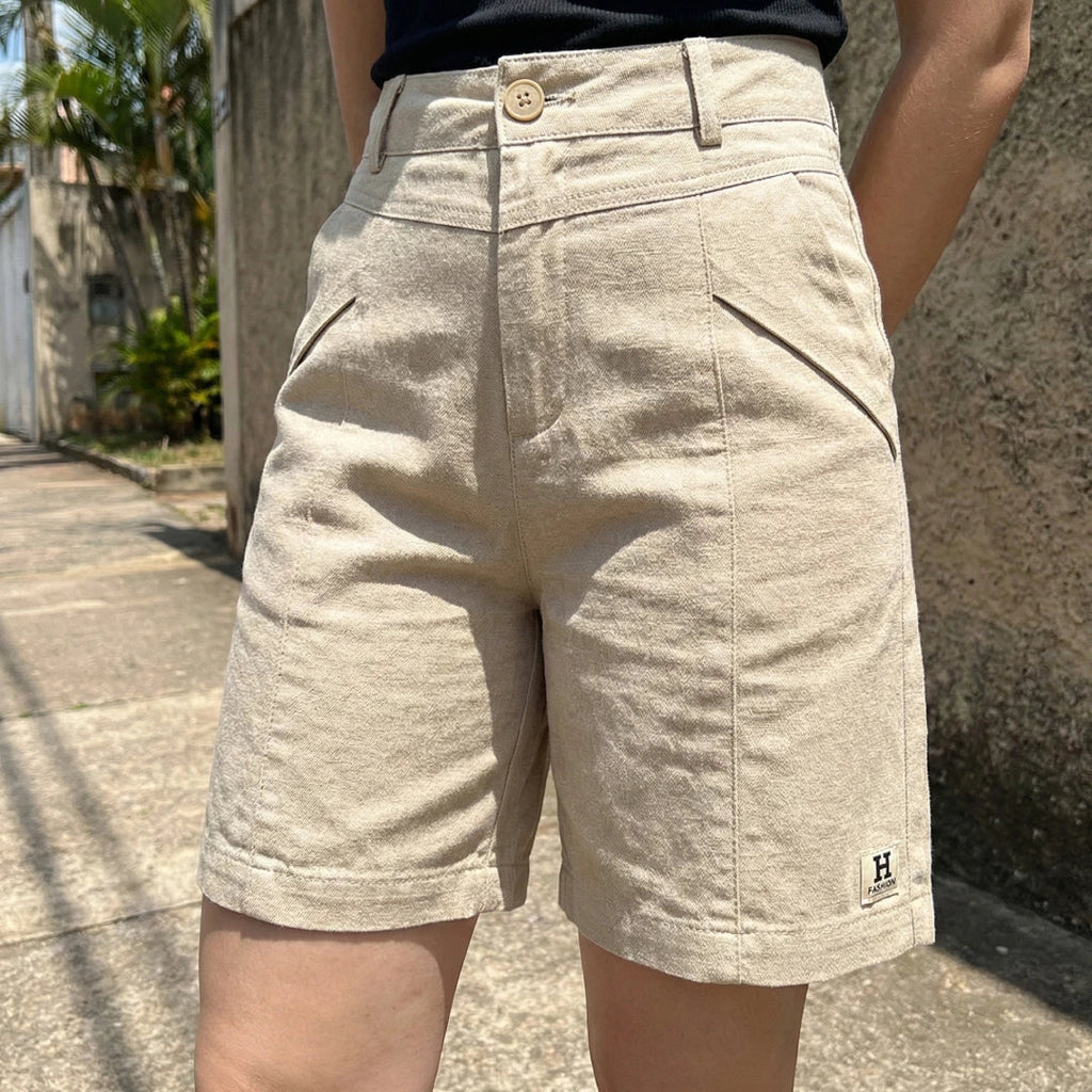 [Leve 5, Pague 3] Bermuda Viena Feminina em Linho e Algodão de Cintura Alta com Nervuras Frontais
