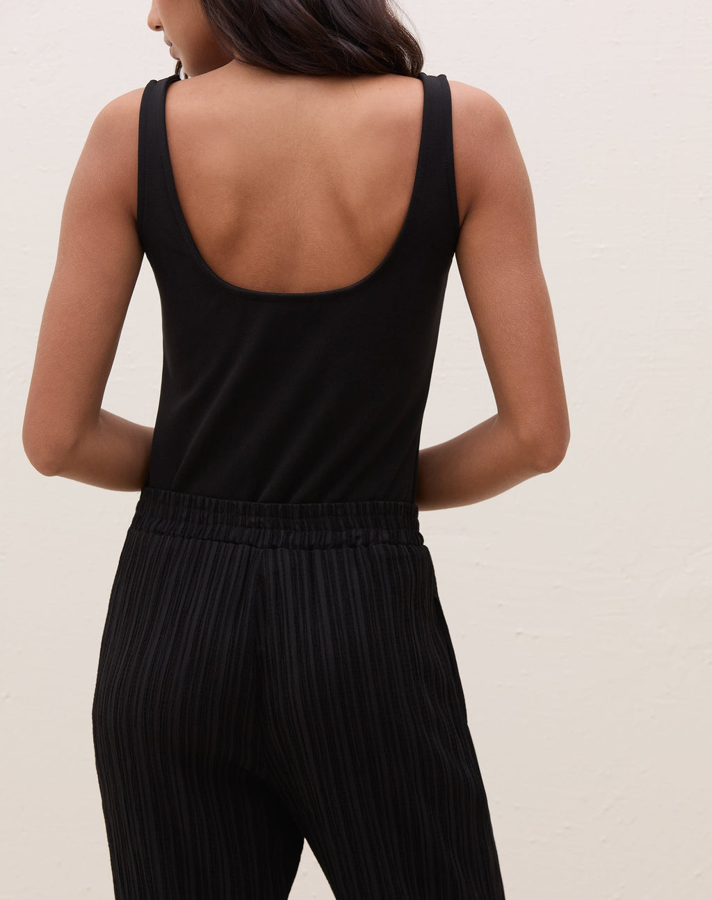 Body regata de malha creponada, peça versátil e cool para um look elevado. Ideal para ocasiões casuais e clima quente.