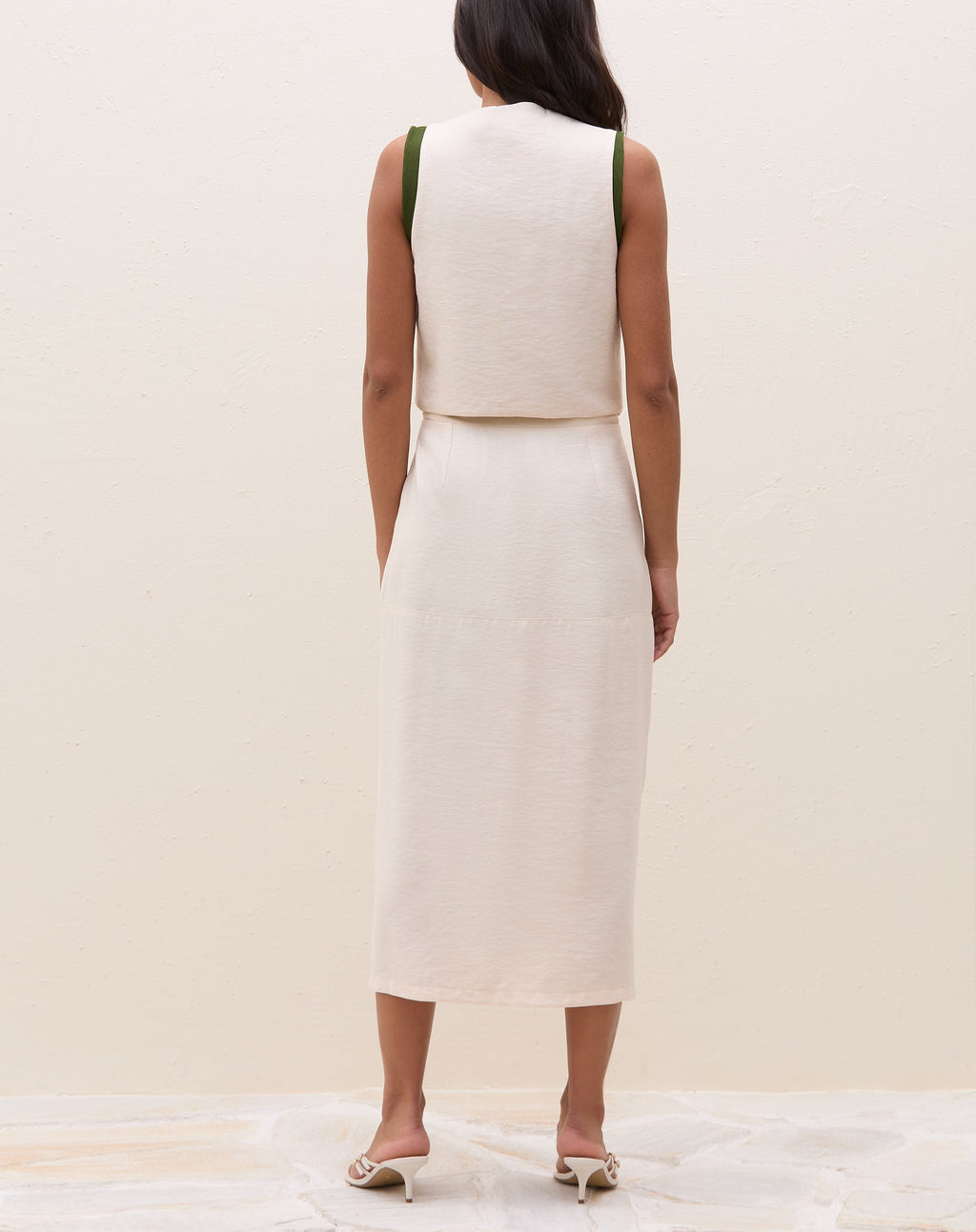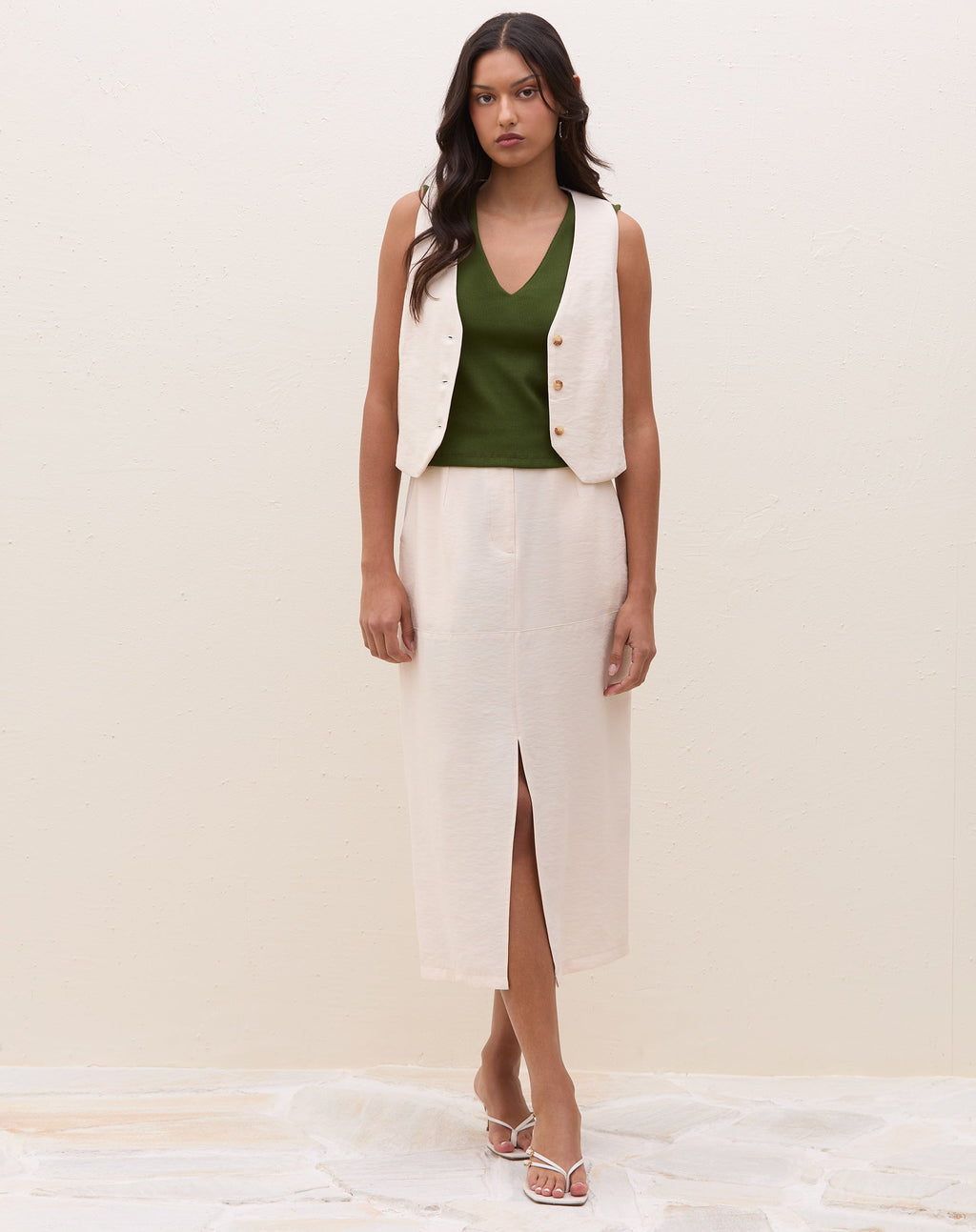 Saia midi com fenda frontal em alfaiataria, perfeita para um look elegante e moderno. Versátil, pode ser usada do trabalho ao happy hour, garantindo sofisticação e estilo.