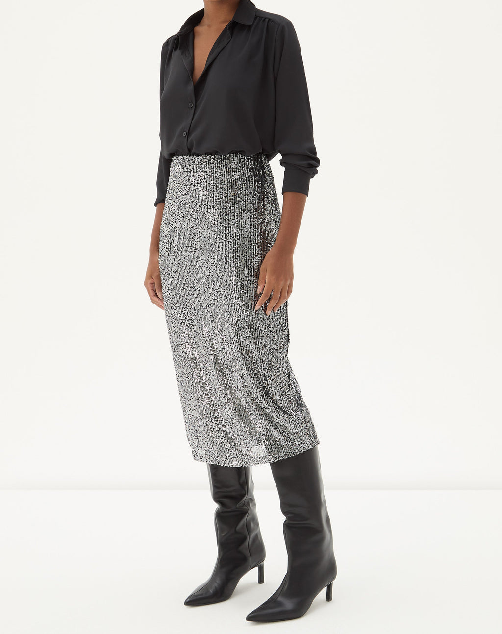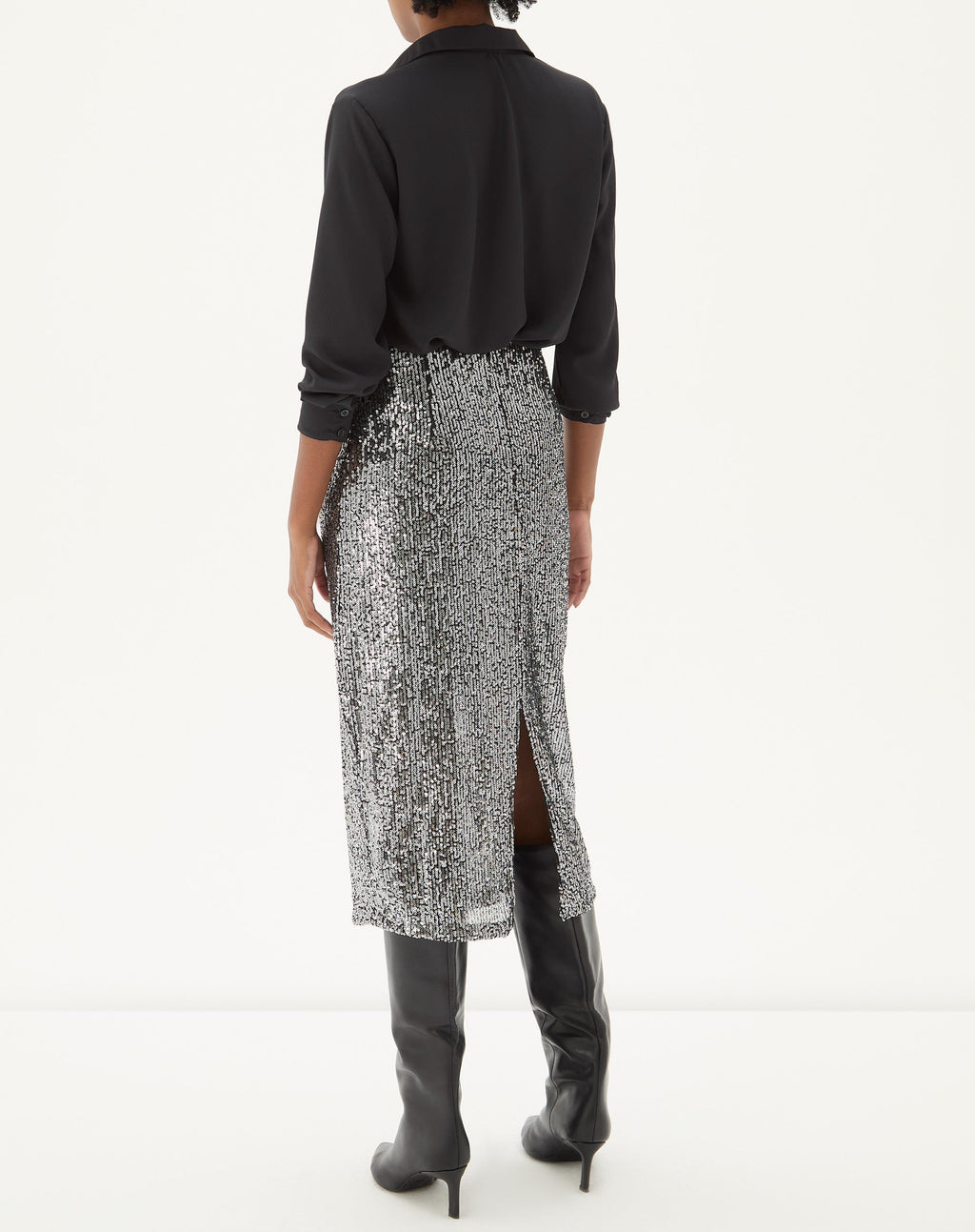 Deslumbre com esta saia midi tubo de paetê, perfeita para festas noturnas. Seu brilho único e cintura alta garantem um look elegante e moderno.